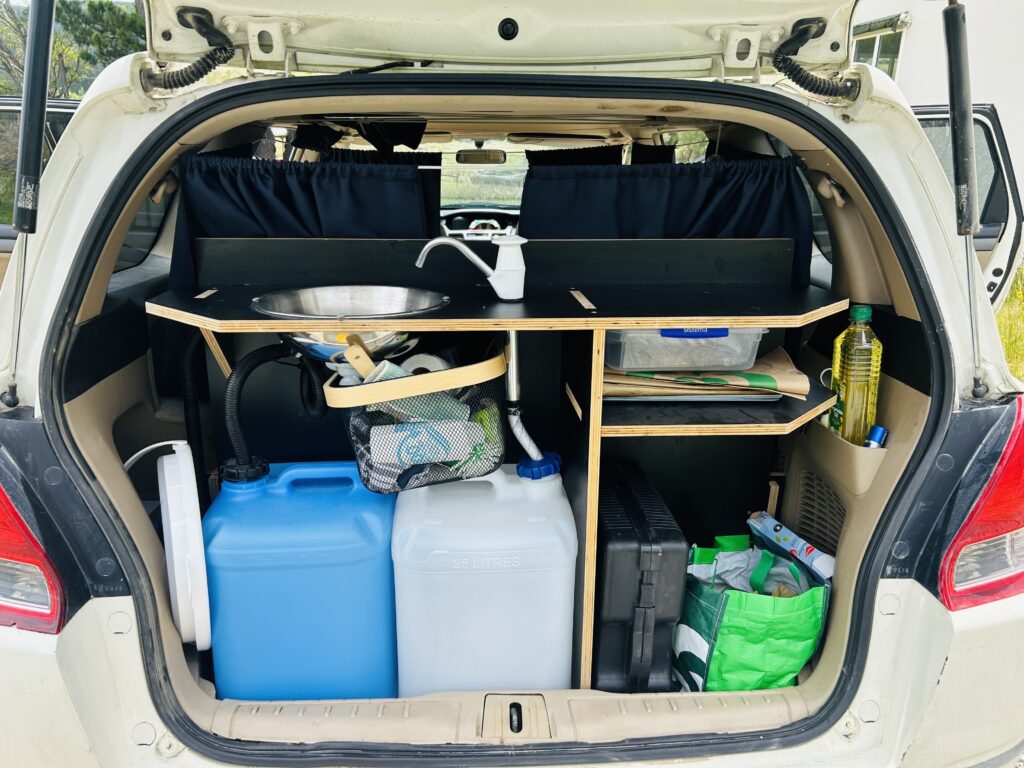 β€’ 2x 25l tanks (fresh water and waste water) + sink and fresh water pump β€’ 🚽 toilet inside vehicle β€’ bluetooth box plus 2 adapter for using charging cable in the car